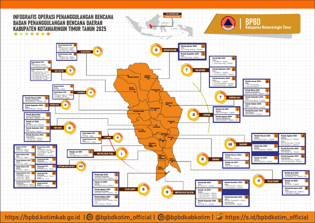 Dari data diatas, adalah data yang dapat di rekam oleh Pusdalops PB BPBD Kabupaten Kotawaringin Timur. Berbagai kejadian bencana yang terjadi pada Tahun 2025 di Wilayah Kabupaten Kotawaringin Timur. Rincian kejadian sebagai berikut :